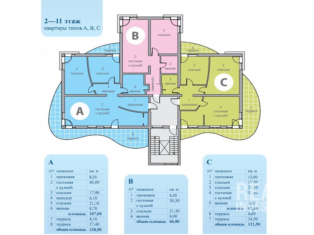 3 комнатные квартиры. 107 кв.м. 2-11 этаж. С террасой (31,5 кв.м.). Цена 247 572 EUR - 342 036 EUR;