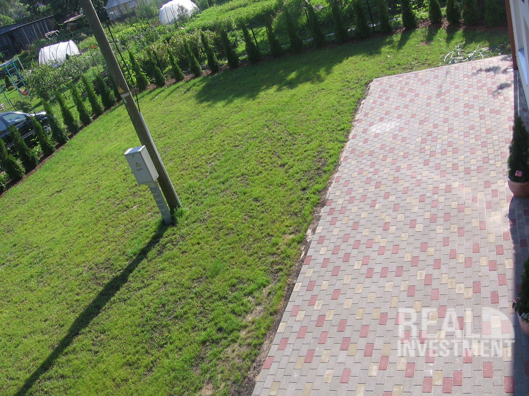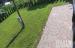 Ухоженный участок, частично выложен брусчаткой, частично - газон. |